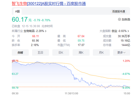 值得瞩主义是,智飞生物盘中一度大跌9.4%,收盘下落8.78%报60.17元,最新市值1444亿元。