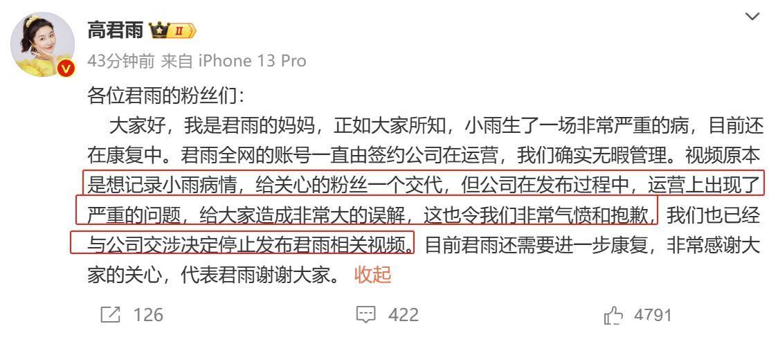其母用高君雨的微博发声,称儿子照实发生了一场特地严重的病,母亲还在康复中。而儿子的账号一直由签约公司运营,他们莫得在处置,视频本来是记载儿子病情的,但在职责发布经由中,出现了严重的问题,给全球变成了特地大的歪曲。他们也很讨厌和对不起,并随后跟公司交涉决定罢手发布高君雨关系视频。