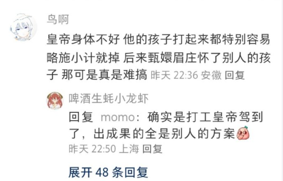 还有一些生物学问和物理学问双管都下的谜底。比如这条“天子体格不好,他的孩子打起来都相当容易,略施小计就掉,其后甄嬛眉庄怀了别东说念主的孩子,那但是真的难搞。”底下有网友套用当下社畜,指摘可谓点睛之笔“如实是打工天子驾到了,出后果的全是别东说念主的决策。”