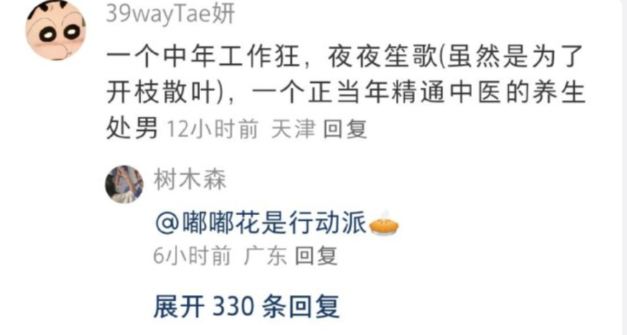 还有套用到现代社畜身上的,“一个中年职责狂,夜夜歌乐(固然是为了开枝散叶),一个刚直年忽闪中医的养生X男。”似乎有那么点意念念。