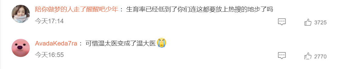 另外两条指摘则让东说念主吐上一口老血,“生养率照旧低到了你们连着都要方上热搜的地步了吗?”以及“可惜温御医形成了温大医。”